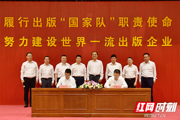 中國(guó)出版集團(tuán)黨組成員、中國(guó)出版?zhèn)髅焦煞萦邢薰究偨?jīng)理李巖與湖南出版集團(tuán)黨委委員、中南出版?zhèn)髅郊瘓F(tuán)股份有限公司總經(jīng)理周亦翔分別代表雙方簽署協(xié)議。